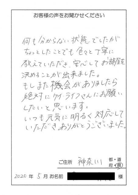 お引越しの原因は虫でした。ご相談をいただいた時はできるだけお引越しをしないで済むように虫駆除のアドバイスをさせていただきました。お引越しにはお金がかかりますからね。するとだんだん虫が出なくなって来たので、引越しをしなくてもいい状態になりましたが、「何かいい物件があったら教えてください。」ということで、いい物件をご紹介させていただきました。ご契約金が安くなるとい...