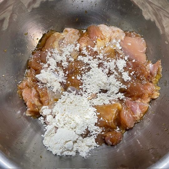 かたくり粉を付け過ぎたようで、から揚げが白っぽくなっちゃいましたが、からっと揚がりました。