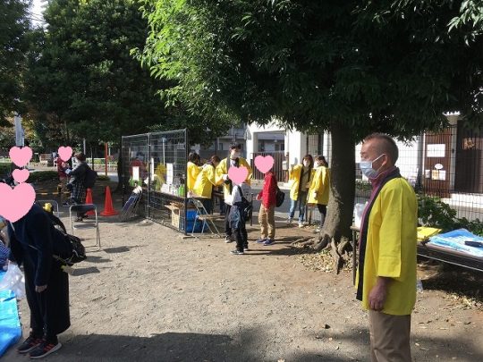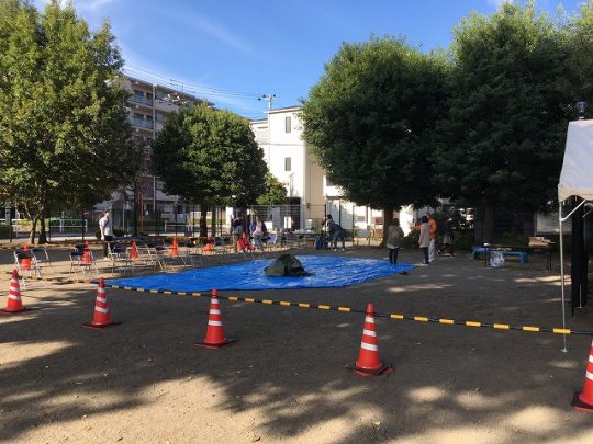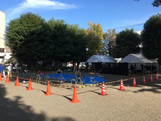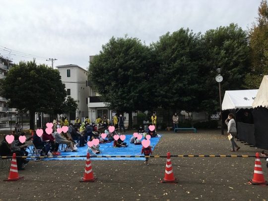 11月3日8時 東橋本公園集合東橋本商店会メンバー、めぐり報さん、東橋本南自治会さん、ステージにご出演いただく橋本マジッククラブさんにも朝早くからお集まりくださり、会場設営をお手伝いしていただきました。