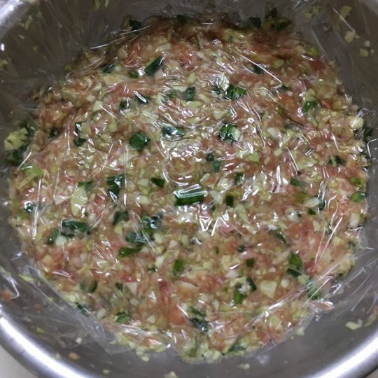 京都市左京区大原から塩漬けもみ紫蘇が届きましたので、樽にもみ紫蘇を投入します。