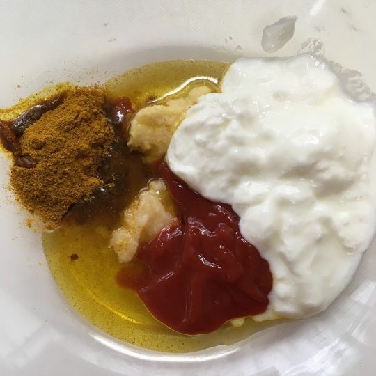 先ほどのヨーグルトやケチャップ、おろしニンニクなどをボウルに入れ