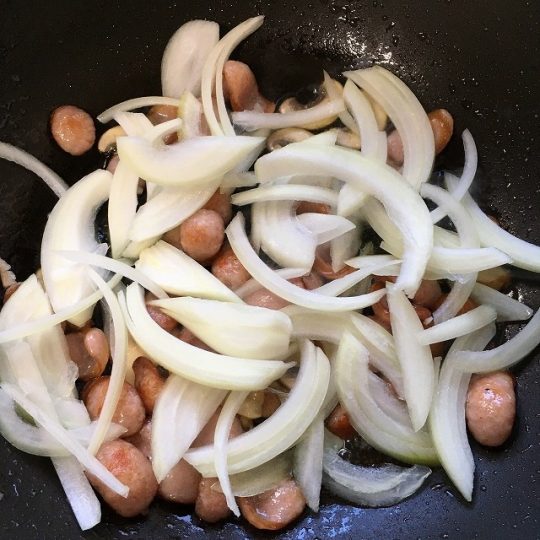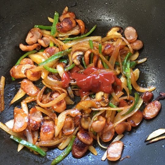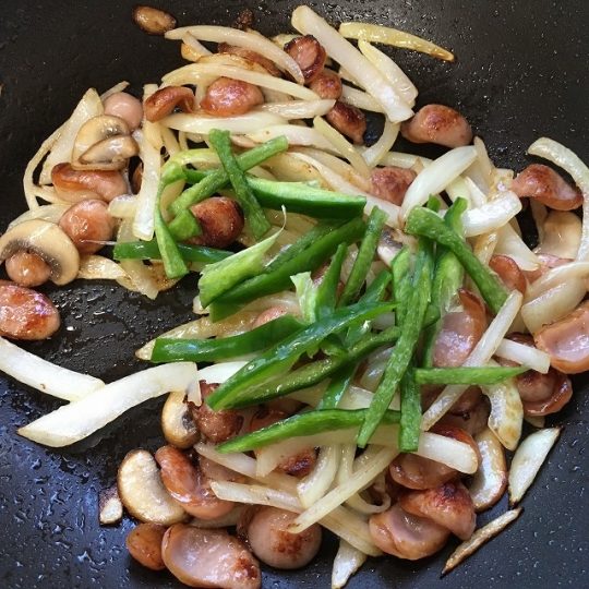 ピーマンと玉ねぎは良かったのですが、マッシュルームを早く入れすぎました。