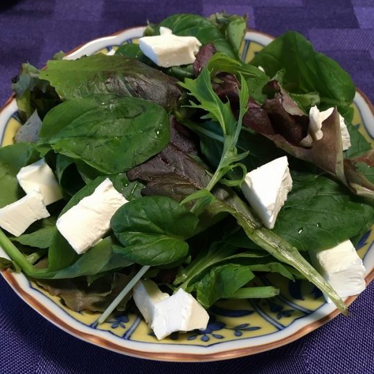 ベビーリーフにクリームチーズを乗せたので、オリーブオイルでどうぞ