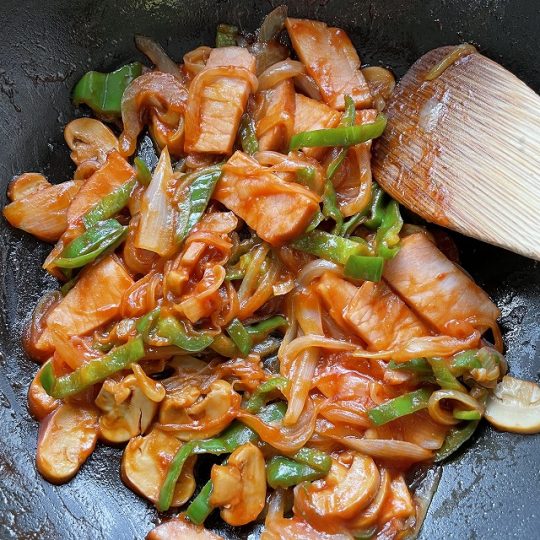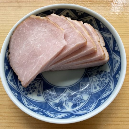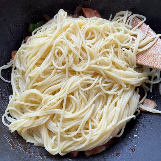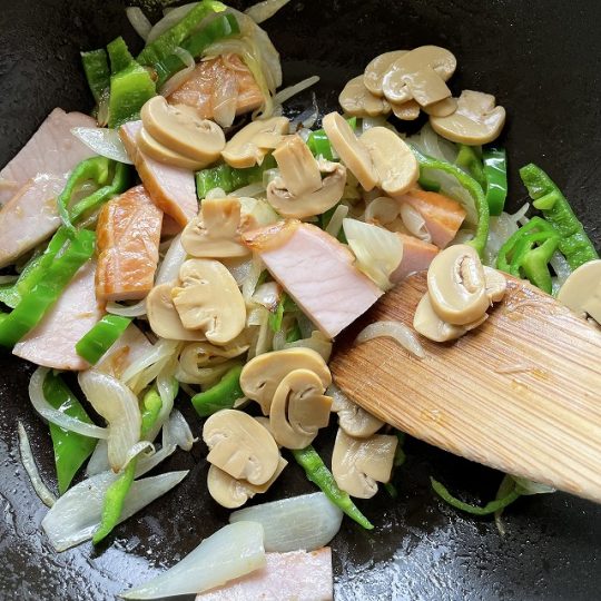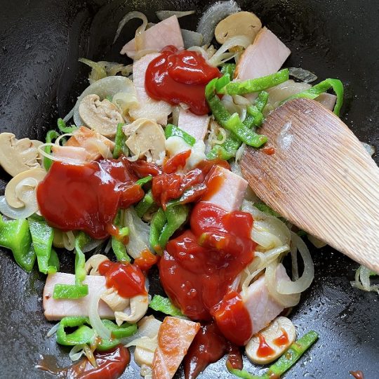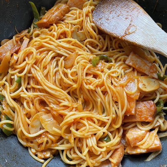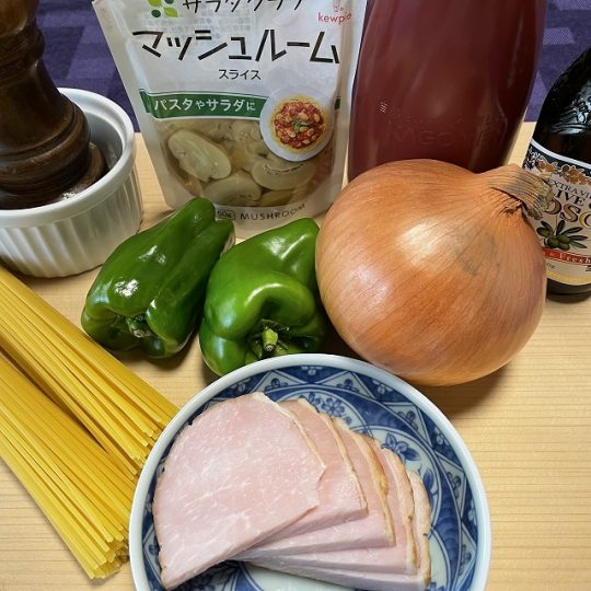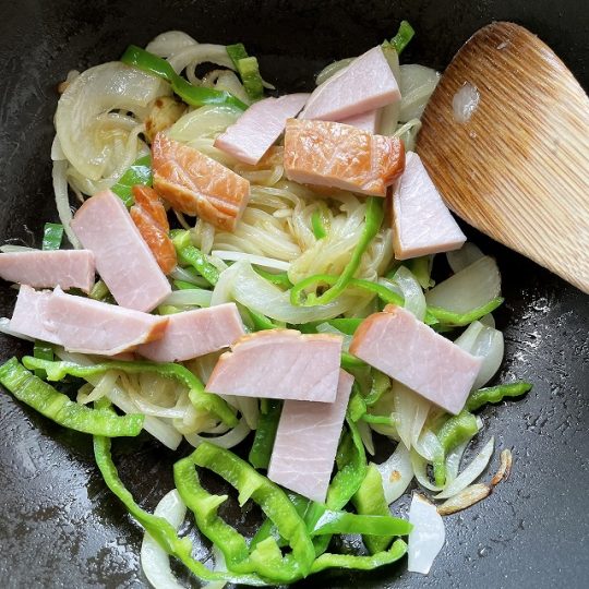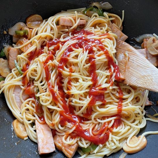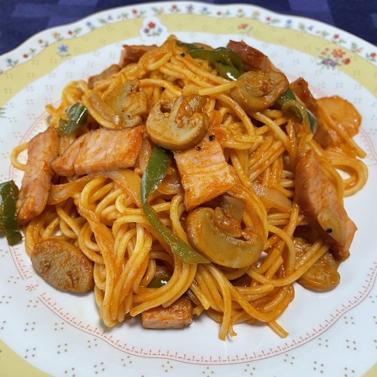 お中元でいただいたハムをゴロっと入れた豪快ナポリタン