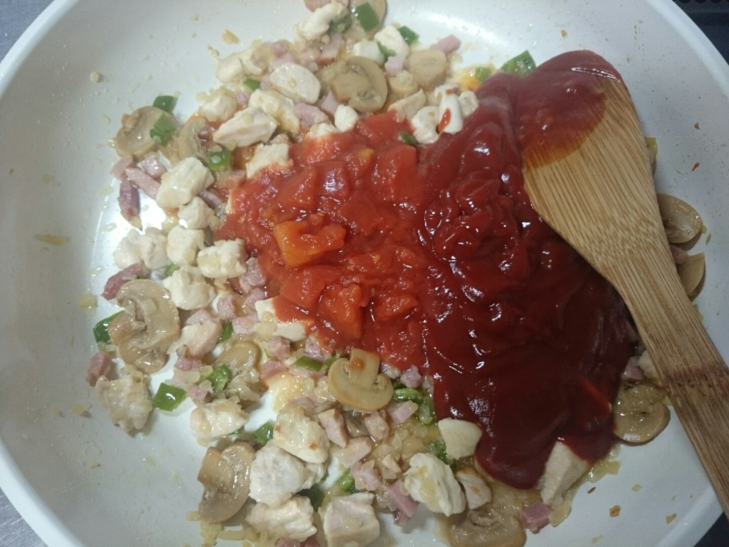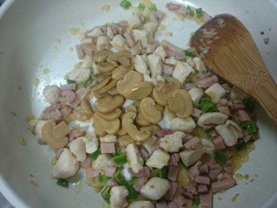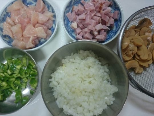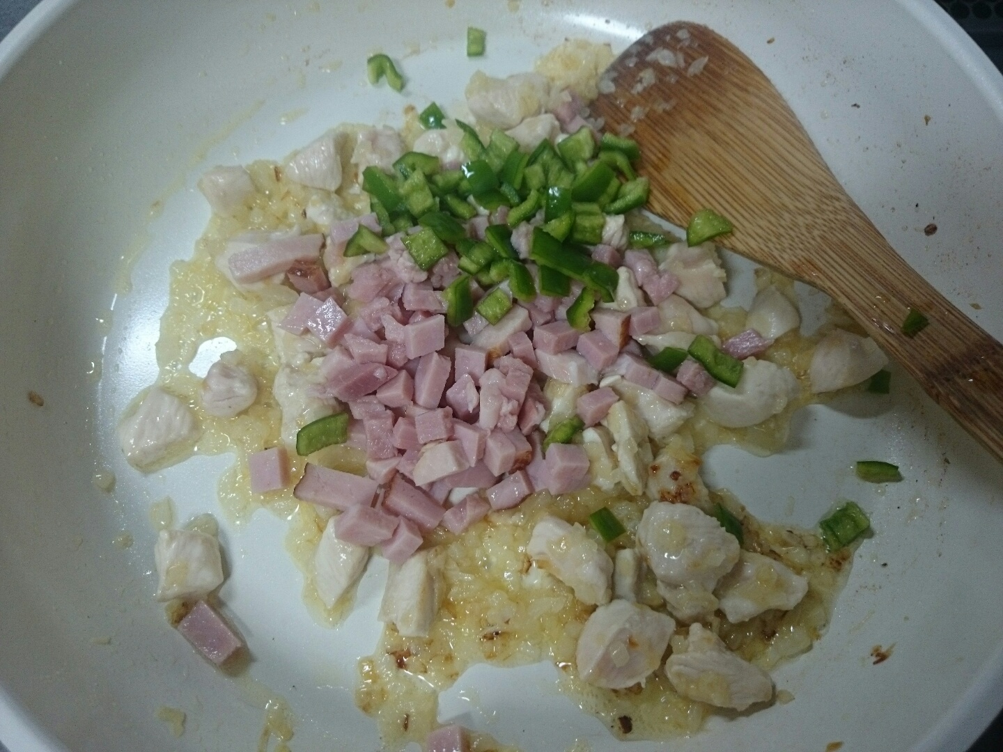 玉ねぎ、ピーマン、鶏むね肉、ハムを刻みます。