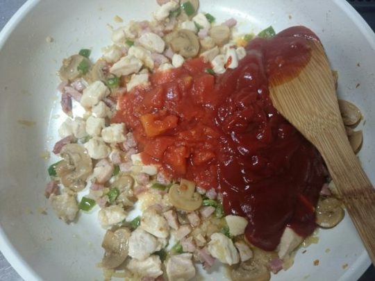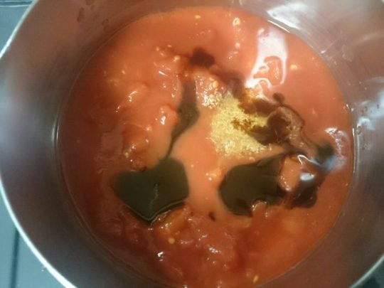 トマト缶とウスターソースにちょっとコンソメを弱火でコトコト。