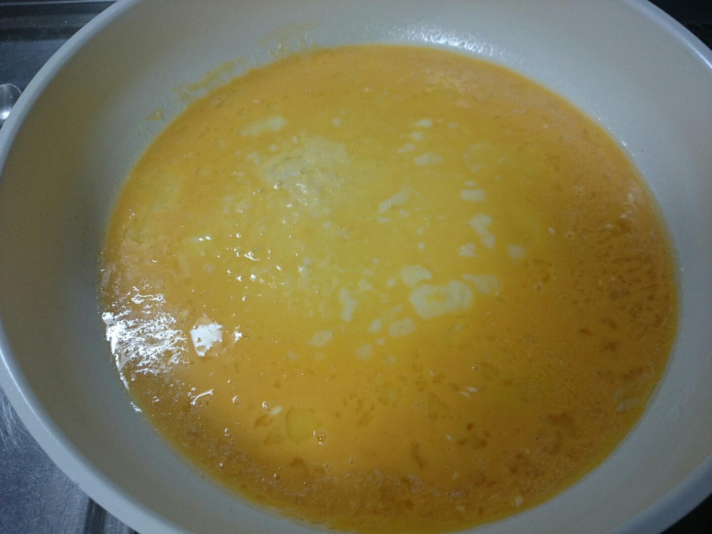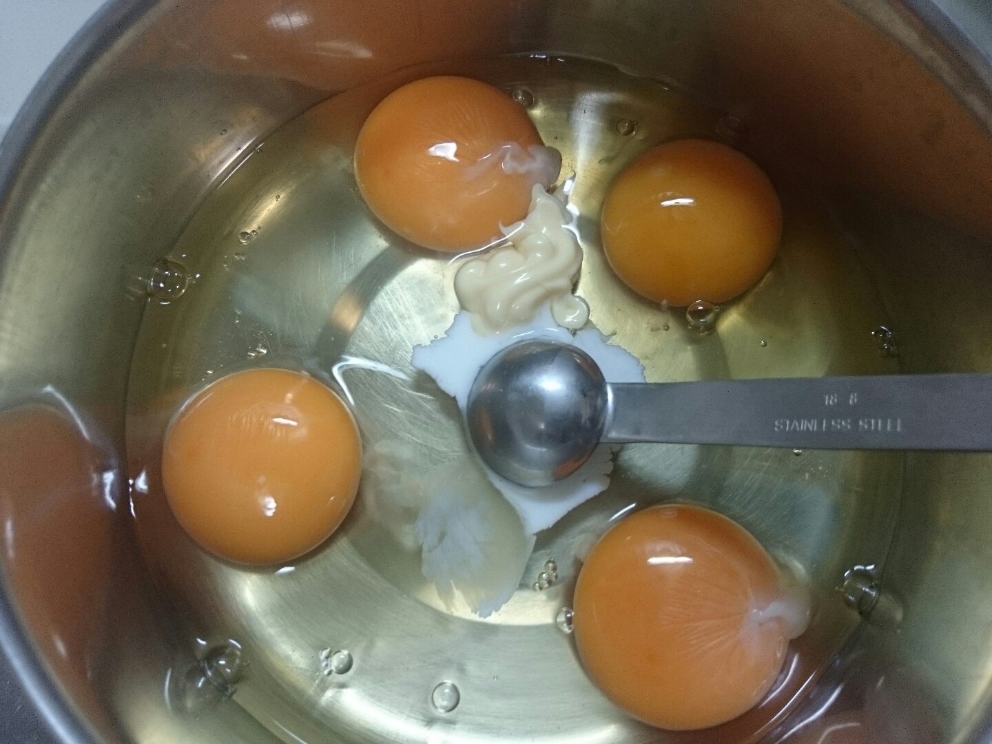 生卵にマヨネーズと牛乳を少し入れて混ぜます。