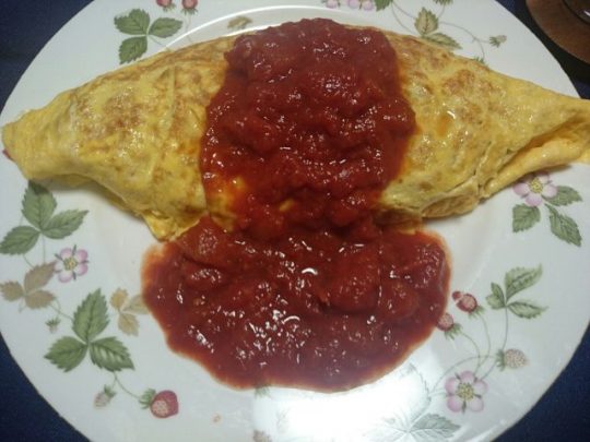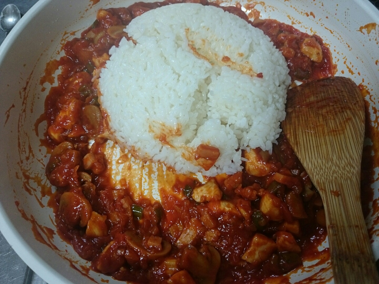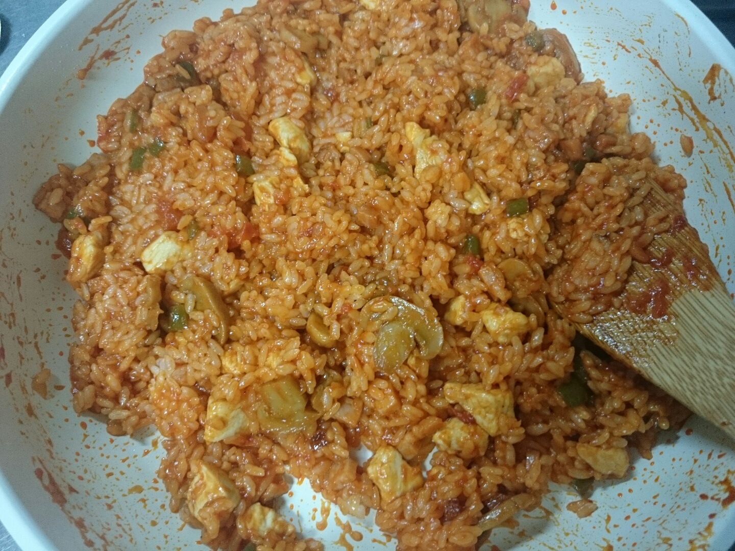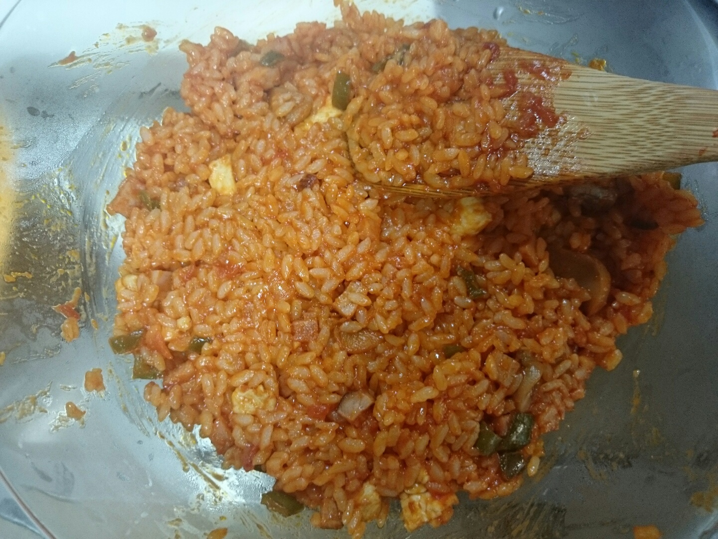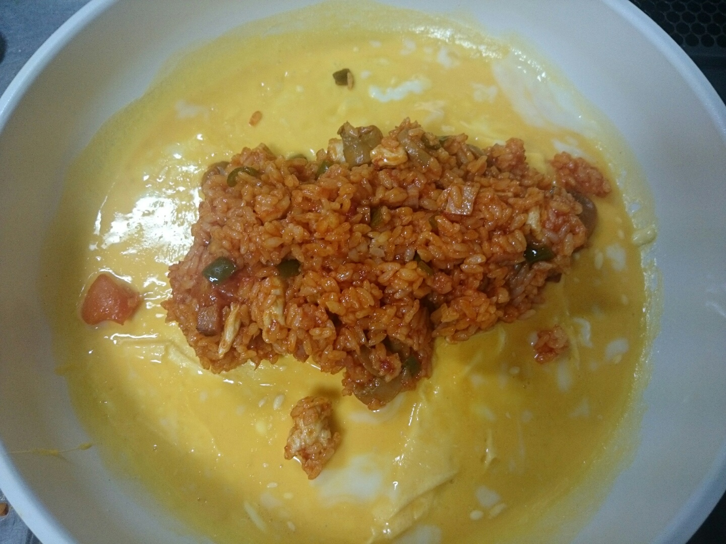 そして、卵を少しずつチキンライスに寄せて、お皿を近づけフライパンを返します。