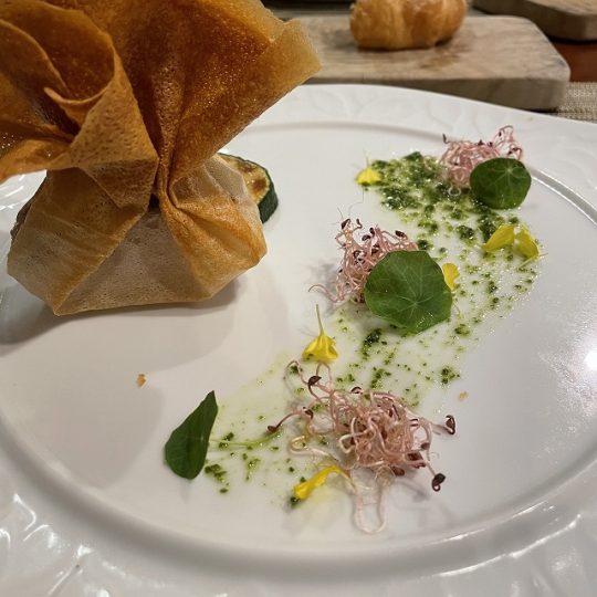 と思ってしまいそうですが、玉ねぎのムースの中にズワイ蟹が隠れている前菜でございます。