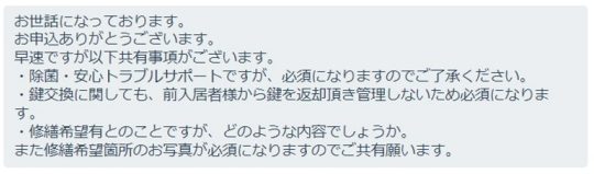 ・「鍵交換に関しても、前入居者様から鍵を返却頂き管理しないため必須になります。」