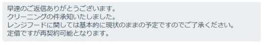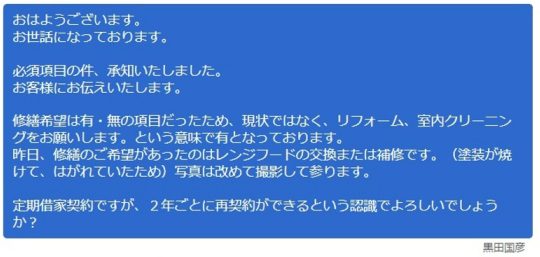 この後、お客様に必須項目やレンジフードの件などをご了承いただき、再びチャット。