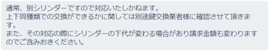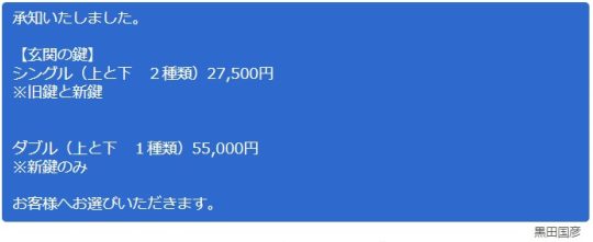 私は鍵交換費用27,500円(税込)でお伝えいたしましたが、管理会社様から今回はダブルシリンダー交換(上下シリンダー)のため、2ヵ所で55,000円(税込)です。と言ってきました。