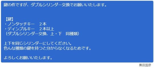 鍵交換費用は25,000円(税別)と表示されていたのに、ダブルだから50,000円(税別)と言ってきました。