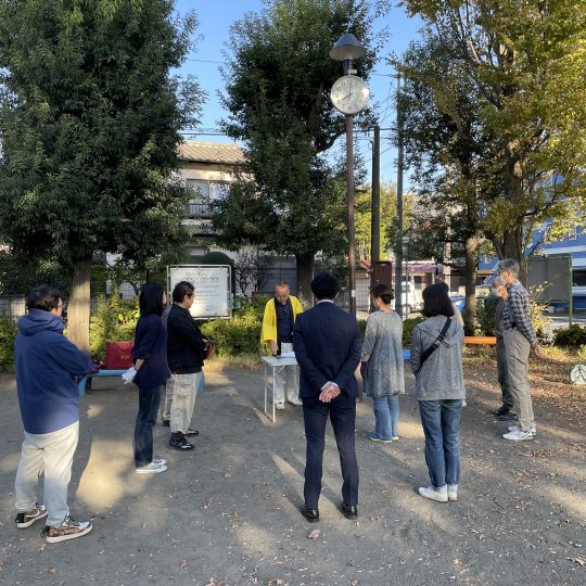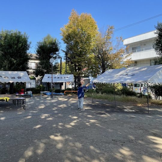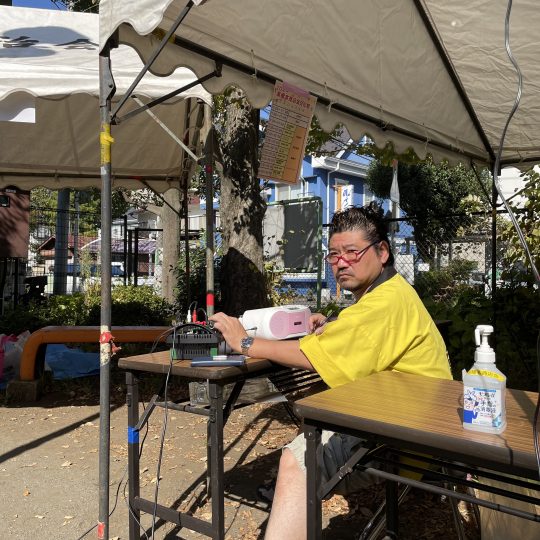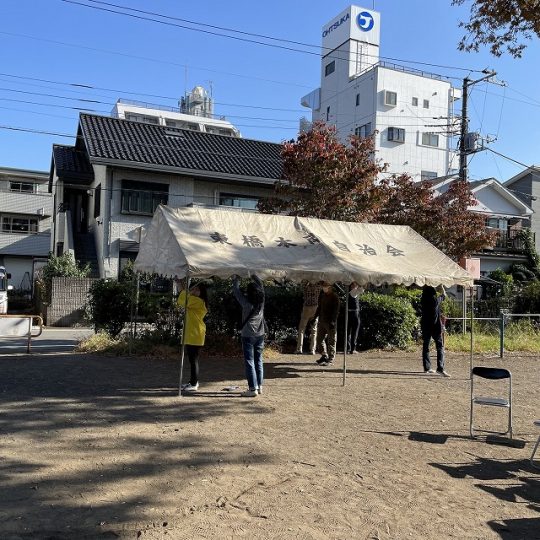 11月3日8時 東橋本公園集合東橋本商店会メンバー、めぐり報さん、東橋本南自治会さん、ステージにご出演いただく橋本マジッククラブさんにも朝早くからお集まりくださり、会場設営をお手伝いしていただきました。