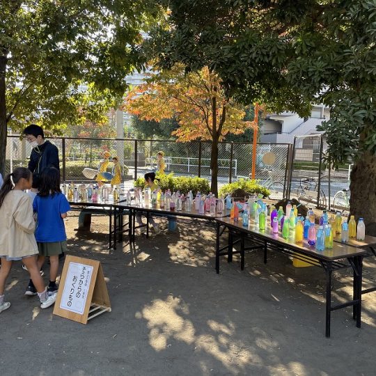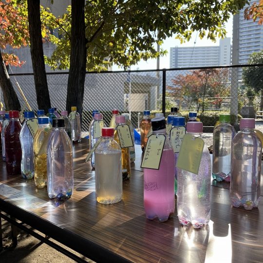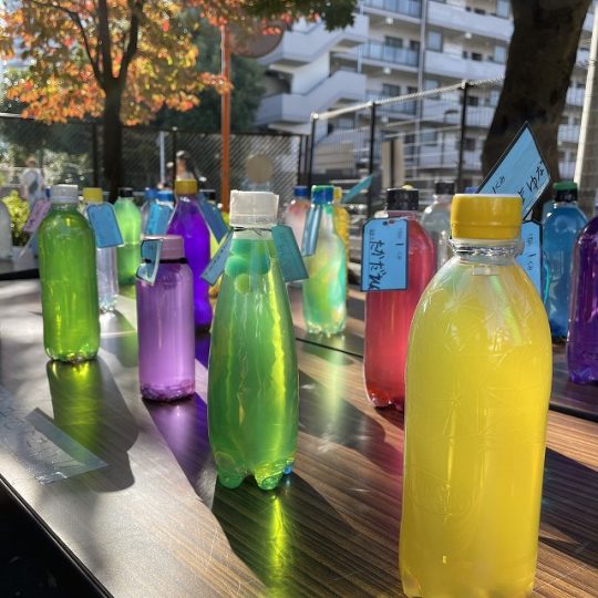 ボトルの中に入ったキラキラした液体を見るとリラックス効果が得られ、子どもの情緒の安定を目的としたセンサリーボトルを展示していただきました。