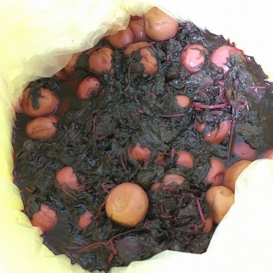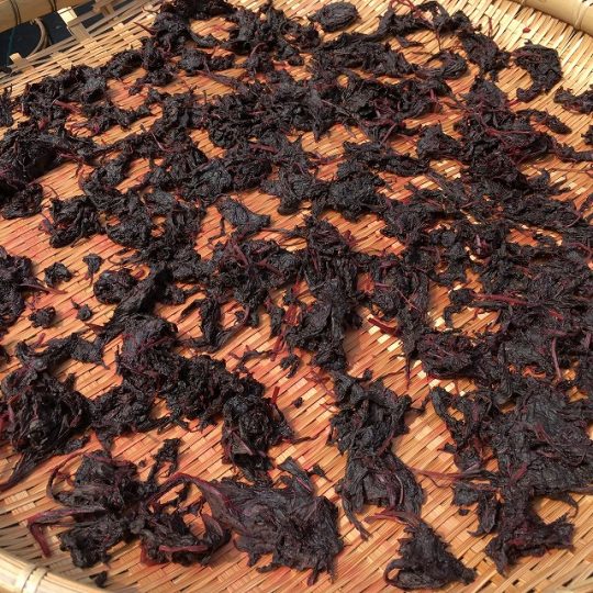 京都市左京区大原から塩漬けもみ紫蘇が届きましたので、樽にもみ紫蘇を投入します。