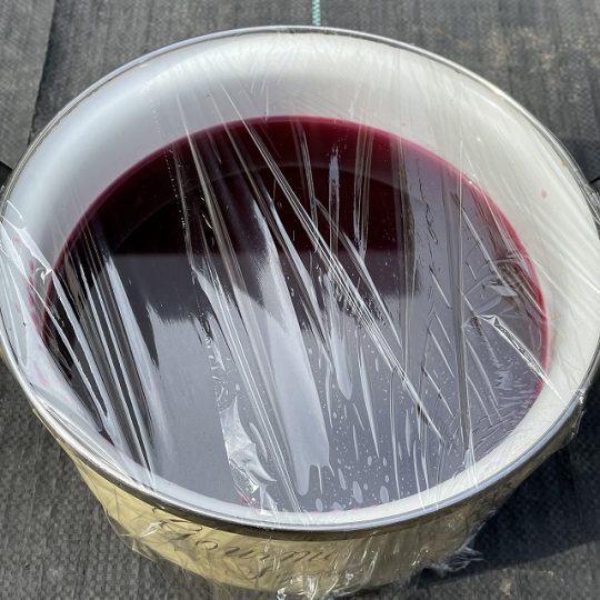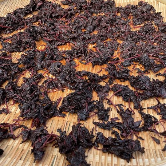 京都市左京区大原から塩漬けもみ紫蘇が届きましたので、樽にもみ紫蘇を投入します。