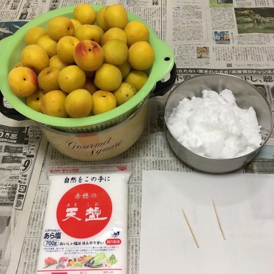 洗った梅と塩、つまようじ、キッチンペーパー、樽を用意