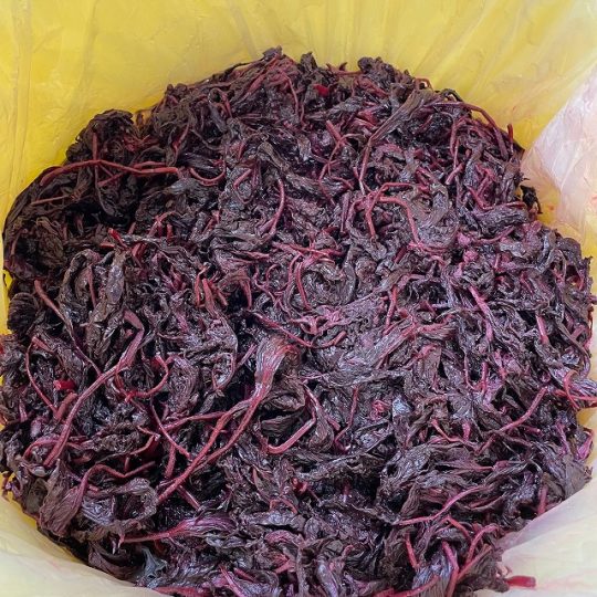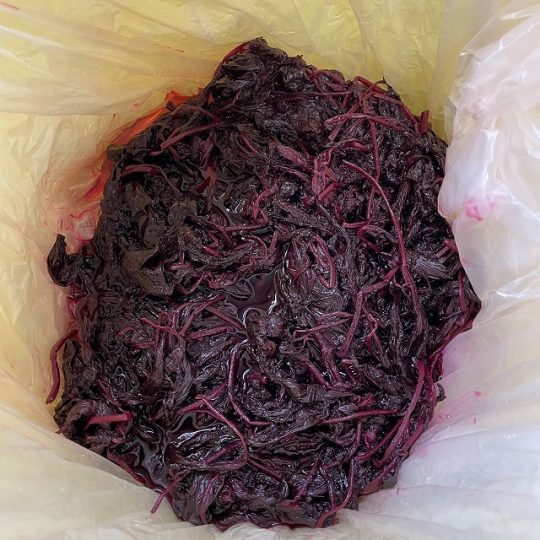本来は枝付き赤紫蘇から葉っぱを1枚1枚集めて、洗って乾かして、アクを絞り出すのですが、大変な作業なので、私は手抜きをして塩漬けもみ紫蘇を購入しています。