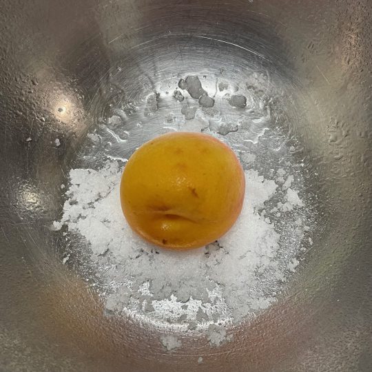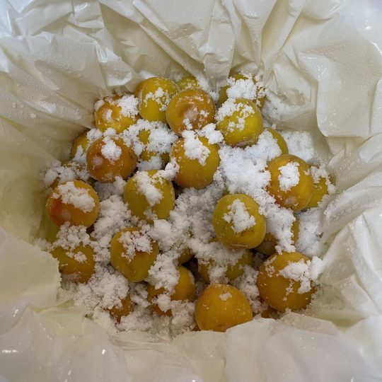樽の中に梅を入れ、最後は塩で蓋をするように塩全分量の3分の1を降りかけます
