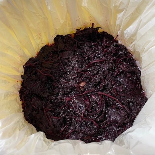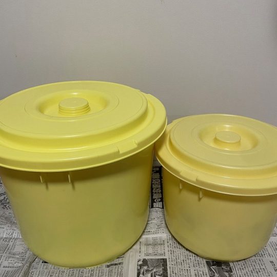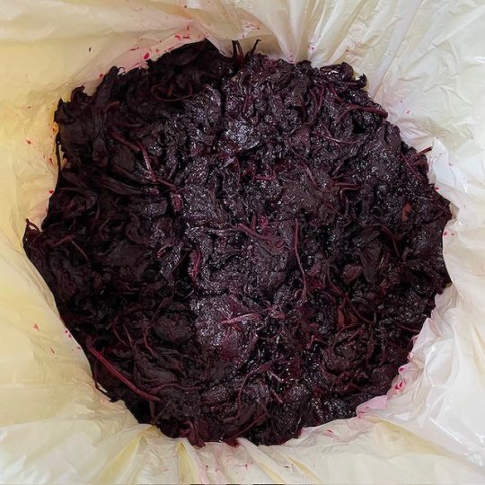 京都市左京区大原から塩漬けもみ紫蘇が届きましたので、樽にもみ紫蘇を投入します。