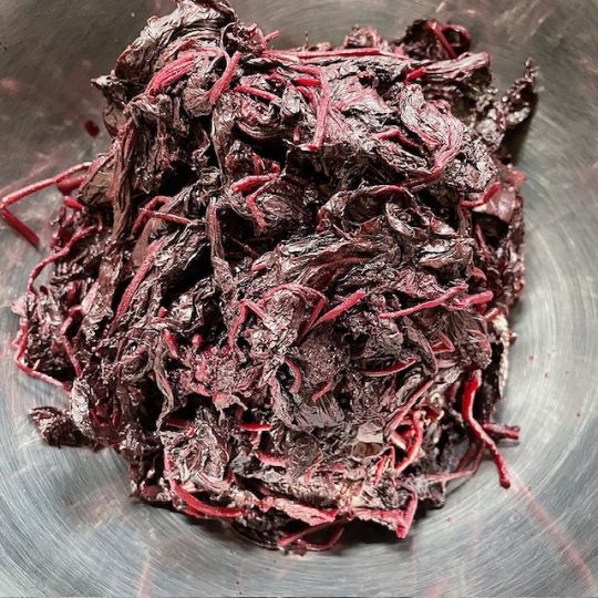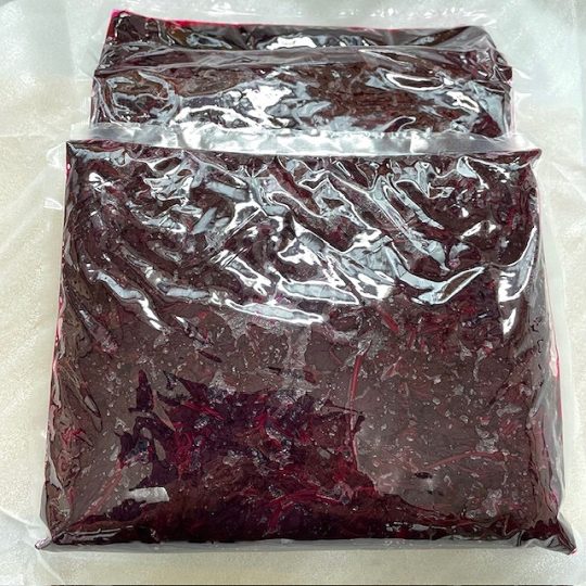 本来は枝付き赤紫蘇から葉っぱを1枚1枚集めて、洗って乾かして、アクを絞り出すのですが、大変な作業なので、私は手抜きをして塩漬けもみ紫蘇を購入しています。