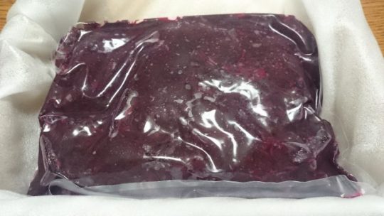 京都市左京区大原から塩漬けもみ紫蘇が届きましたので、樽にもみ紫蘇を投入します。