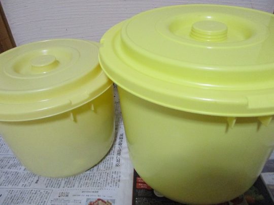 京都市左京区大原から塩漬けもみ紫蘇が届きましたので、樽にもみ紫蘇を投入します。