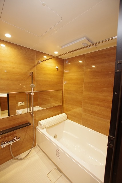 料理をしながらでも、家族の気配が感じられます。木調パネルとダウンライトで落ち着いた雰囲気に整えられたバスルーム。