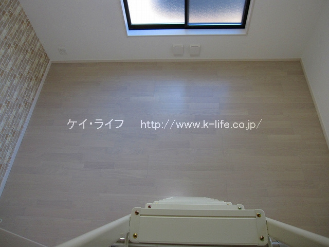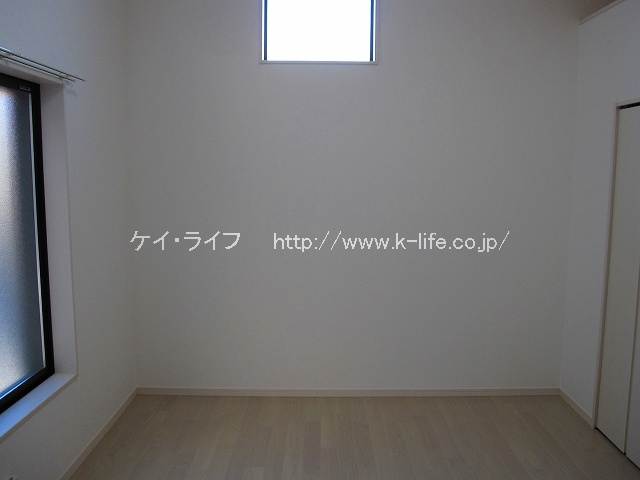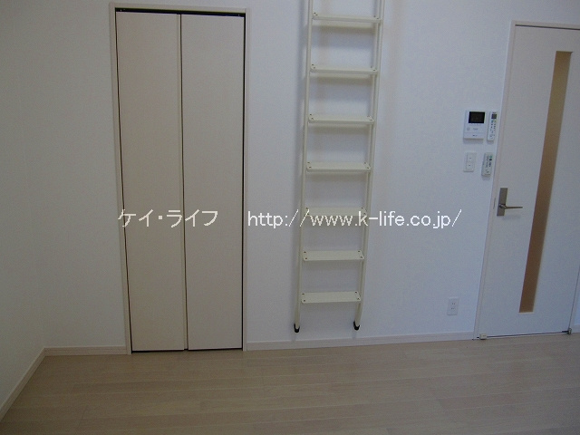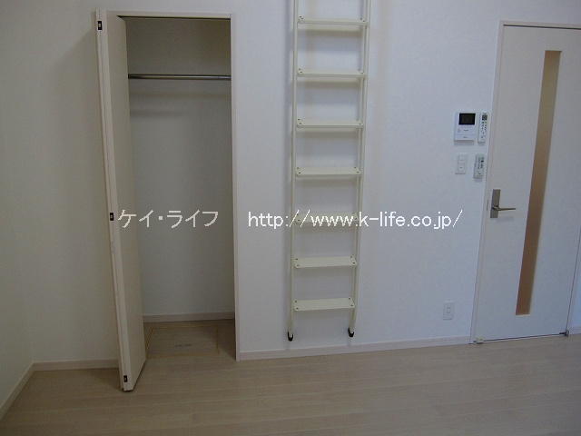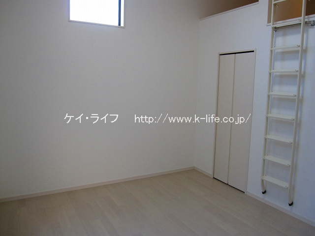 お部屋は洋室7.8帖。天井が高く、開放的な空間ですが、クローゼットが小さい。お部屋の壁側や大型ロフトに衣装ケースを置いて、半年に一度の衣替え、衣類の入れ替えをしましょう。広さと高さのある空間を工夫して楽しめる方におすすめですよ。(^ ^)
