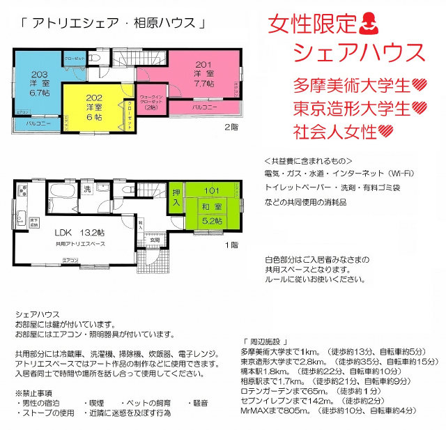 アトリエシェア・相原ハウスは女性限定のシェアハウス。名称に 「アトリエ」 が入っているのはオーナー様がアートがお好きで美大生を応援したいというコンセプトから名付けられました。多摩美術大学東門までは1㎞(徒歩13分・自転車5分)、東京造形大学正門までは2.8㎞(徒歩35分・自転車15分) 駐車場スペースに自転車、バイク4台まで駐輪可能です。作品の制作ができるLDKは13.2帖。入居者共用で使用できるスペースとなっております。冷蔵庫、洗濯機、電子レンジ、炊飯器、掃除機、エアコン、照明器具など家電製品が備わっていますので、お引越しにかかる費用が抑えられますね。そして、共益費には電気、ガス、水道料金、Wi-Fiなどの使用料が含まれておりますので、毎月の光熱費、通信費を気にせずに生活が出来ます。ゆったりとした1坪タイプのお風呂には追い焚き機能と浴室乾燥暖房機能が付いています。セキュリティ対策として、玄関ドアはカードキー、インターホンはモニター付きのため、来訪者の確認ができます。窓にはシャッターが付いていますので、窓ガラスを割られてしまう心配がありません。相原ハウスから徒歩2分のセブンイレブンで、暖めたお弁当が熱々のうちに食べられ、天然温泉の「ロテンガーデン」までは徒歩1分と湯冷めせずに就寝できますね。女子大学生だけでなく、女性の社会人さんも大歓迎です!!