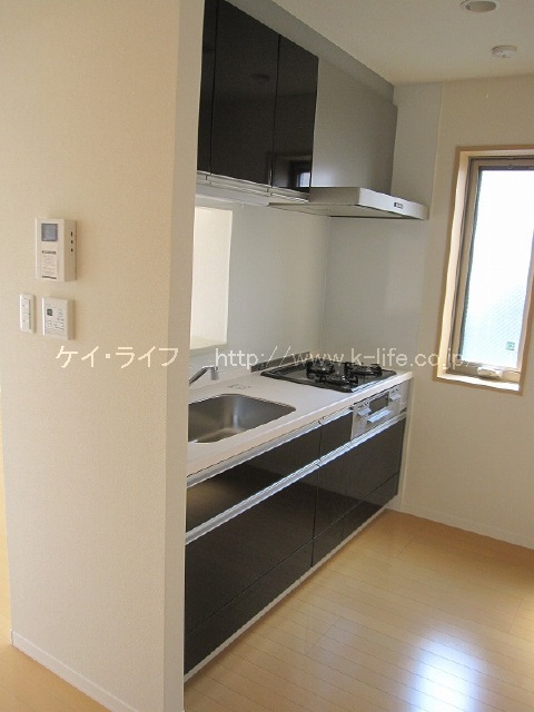 キッチンはスタイリッシュなブラック×ホワイトのシステムキッチン。