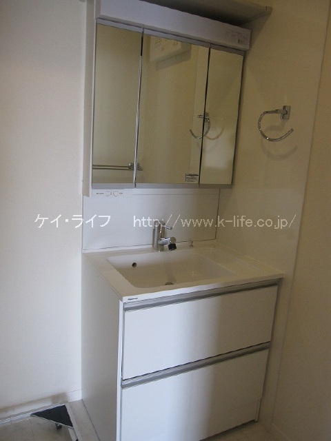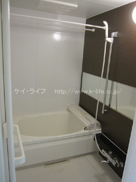 隣りの棚付き収納には小物や本、日用品など、大容量の収納力で、ちょっと気持ちに余裕ができます。洗面所にある洗濯機の置台はキャスター付きでお掃除が楽。バスルームは清潔感のあるホワイトにブラウンのアクセントパネル。追焚き・浴室乾燥機付きで、いつでも快適なバスタイム♪