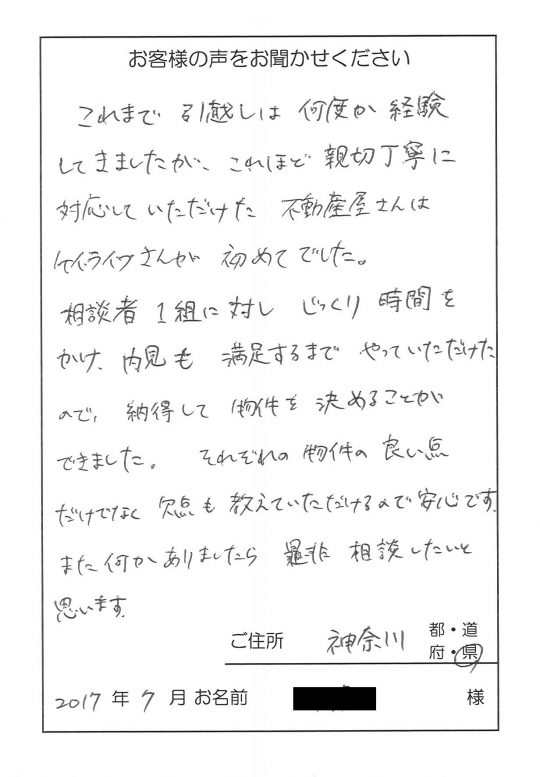 2LDK以上、出来るだけ橋本駅に近い物件をということで、分譲賃貸マンションやテラスハウスなどをご覧いただき、タイプ別に特徴をご説明させていただきました。前のお住まいは、上階の生活音が響いて気になってしまうことも、お引越し理由のひとつでした。今回お決めいただいた物件は少し橋本駅から離れていたので、実際に物件から橋本駅までを歩いていただき、距離や音の問題もクリアにして、さらに都市ガスの物件をお選びいただきました。お二人がいつも仲良く、ニコニコされていたので、幸せを分けていただきました。どうもありがとうございます。