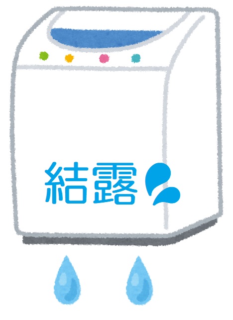 気温が高く水温が低いとき、気温が低く温かい風呂水や温水で洗濯したときなど、水温と室温の温度差が大きい場合には洗濯乾燥機に露が付いて(結露)床面がぬれることがあります。