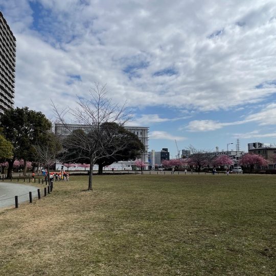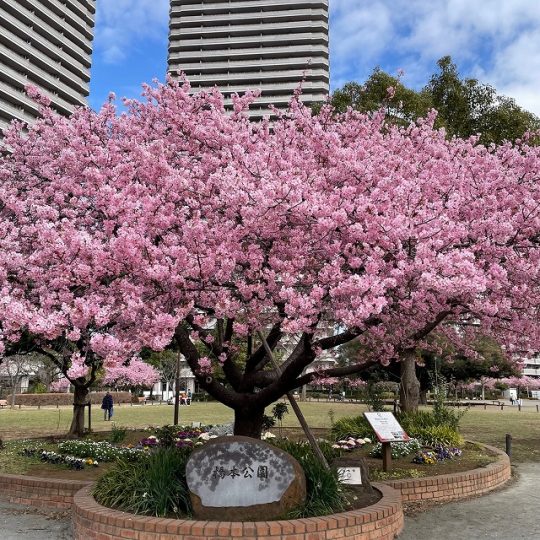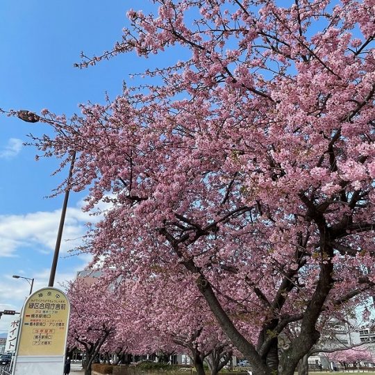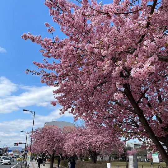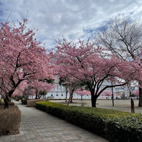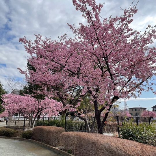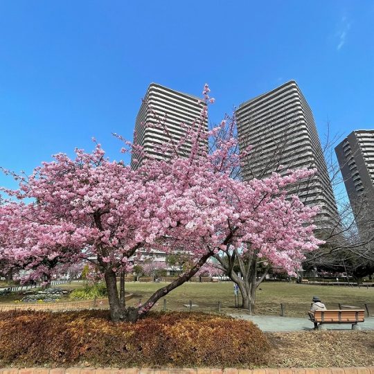 公園のベンチに座って、ゆっくり河津桜と大きく広がる空を眺めるものいいですね。