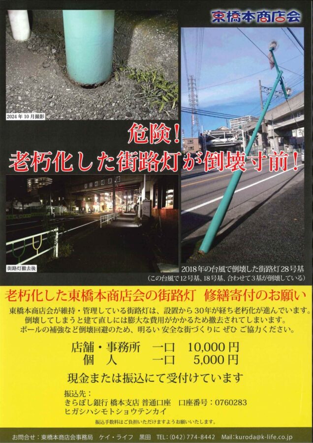 東橋本商店会では街路灯の倒壊回避のため、1本ずつ修繕作業を行っているのですが、修繕費用が高額のため、東橋本商店会の予算が足りず困っている状況です。