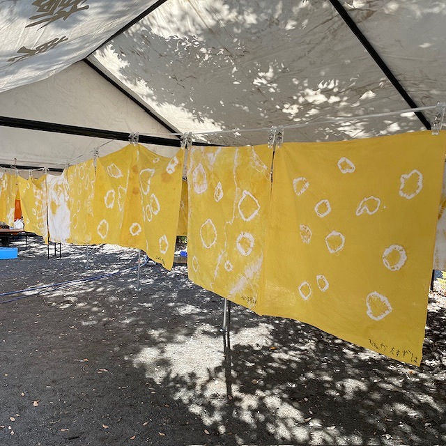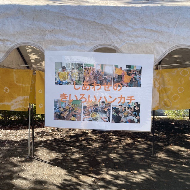 宮上小学校の1年生が一生懸命作った「しあわせのきいろいハンカチ」を展示しました。