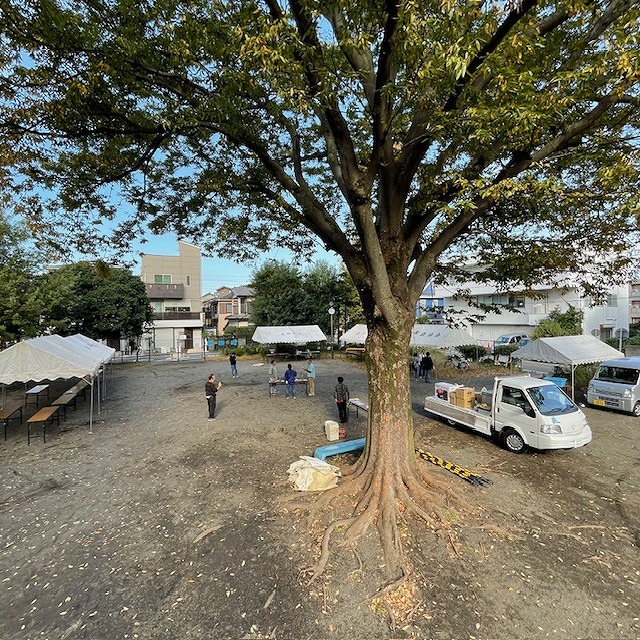 東橋本商店会のメンバーだけでなく、東橋本南自治会さん、東橋本第一自治会さん、ご近所の方々、めぐり報さん、みなさんのご協力のおかげでテント設営がほぼ完了