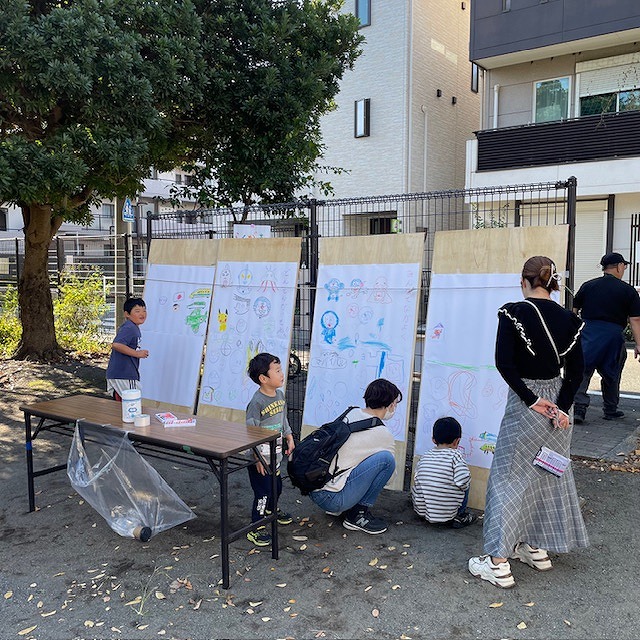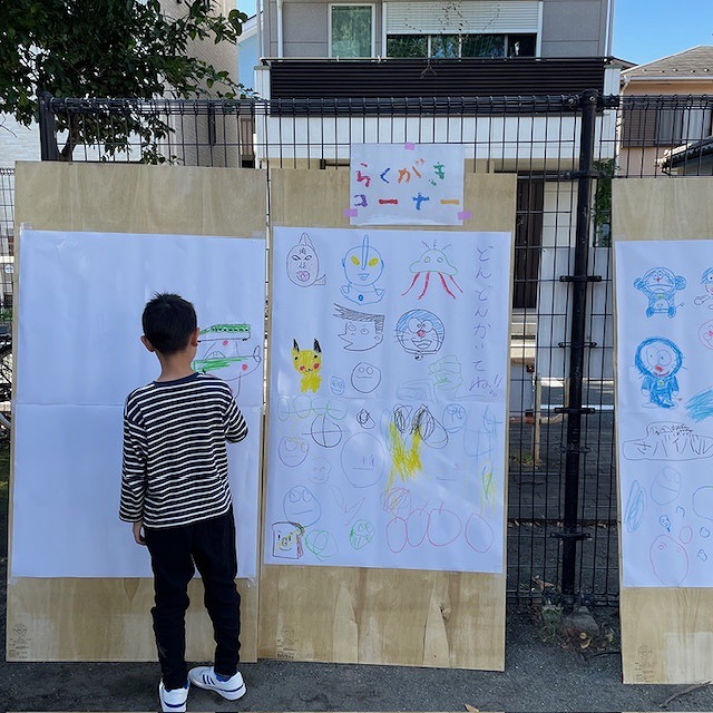 大人も子供も大きな紙にクレヨンを使って自由に好きな絵を書いてもらいました