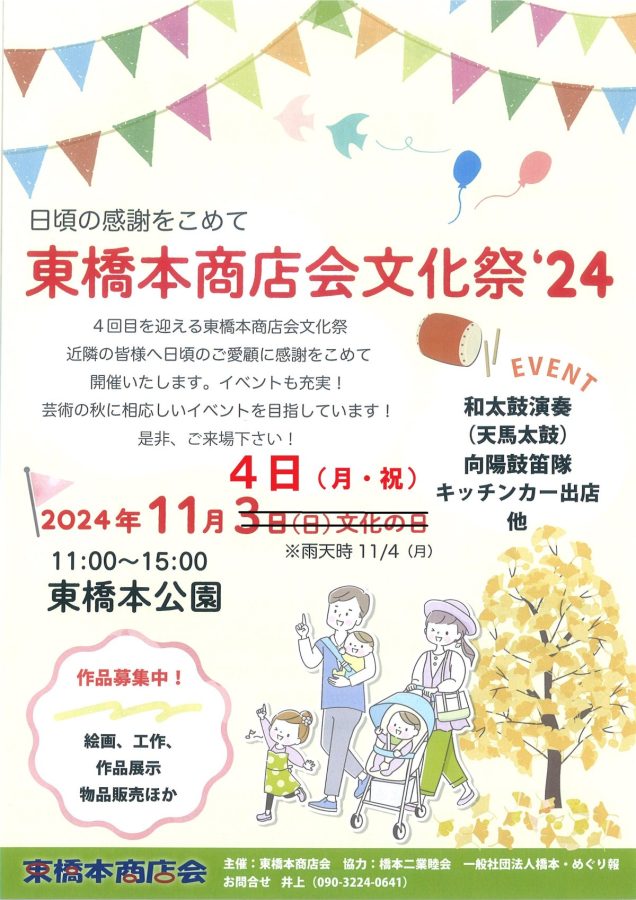 毎年11月3日(文化の日)に開催している東橋本商店会文化祭ですが、今年は天気予報が雨だったため、急遽、開催日を11月4日に変更いたしました。