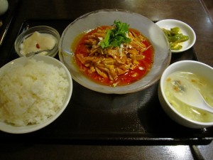 辛くて美味しいたれのかかった鶏のやつ定食です。