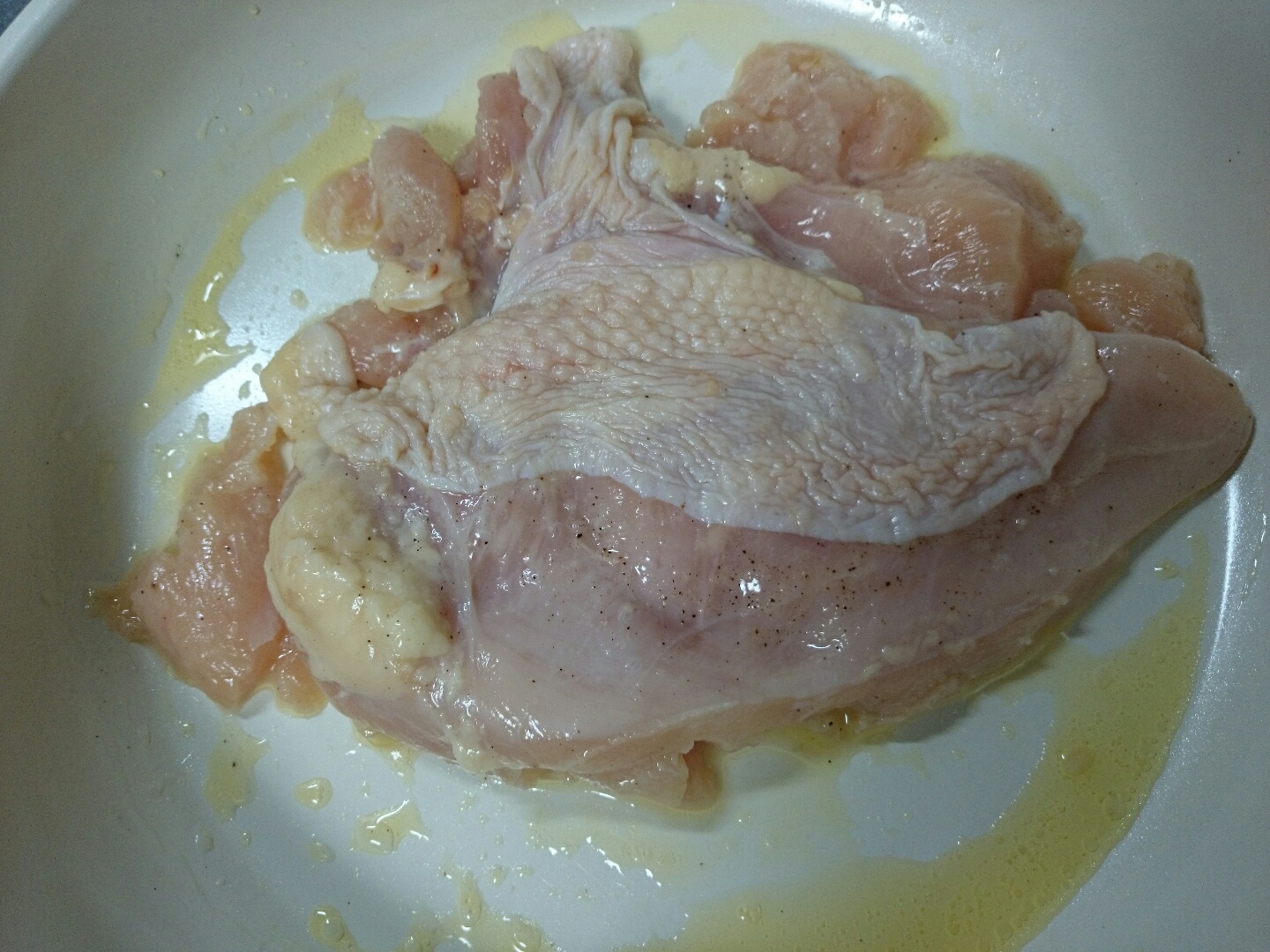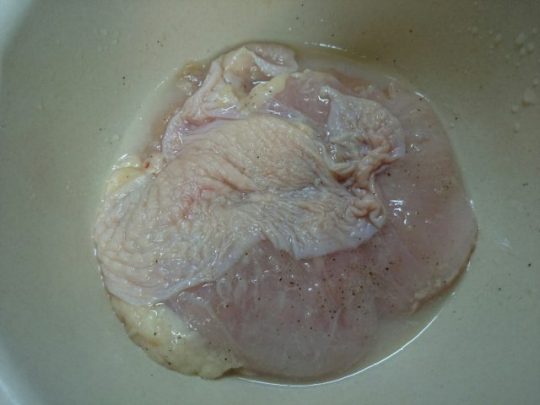 鶏肉に塩、こしょう、にんにくのチューブと白ワインを揉みこんで、30分置いておきます。