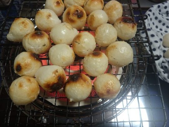 電気コンロでゆっくり、コロコロと焼き、しょうゆを付けて食べました。
