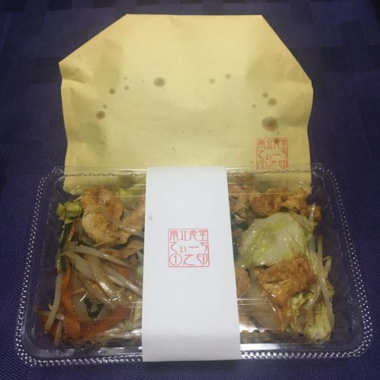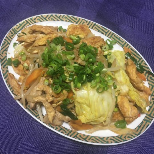 キャベツ、もやし、ニンジン、ネギ、お肉も入って具沢山なおかずですよ。