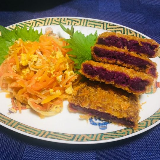 紫色した紅芋コロッケは程よい甘さでおやつのようなおかずです。