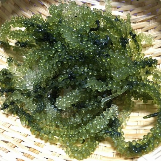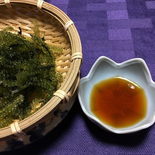 タレは海ぶどうに直接かけないで、お刺身の醤油のように、ちょっとつけてお召し上がりください。