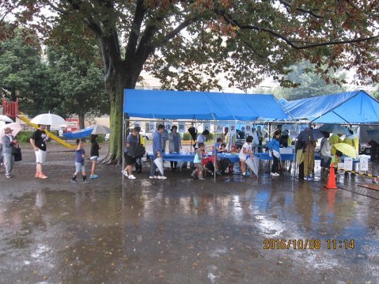 11月3日8時 東橋本公園集合東橋本商店会メンバー、めぐり報さん、東橋本南自治会さん、ステージにご出演いただく橋本マジッククラブさんにも朝早くからお集まりくださり、会場設営をお手伝いしていただきました。