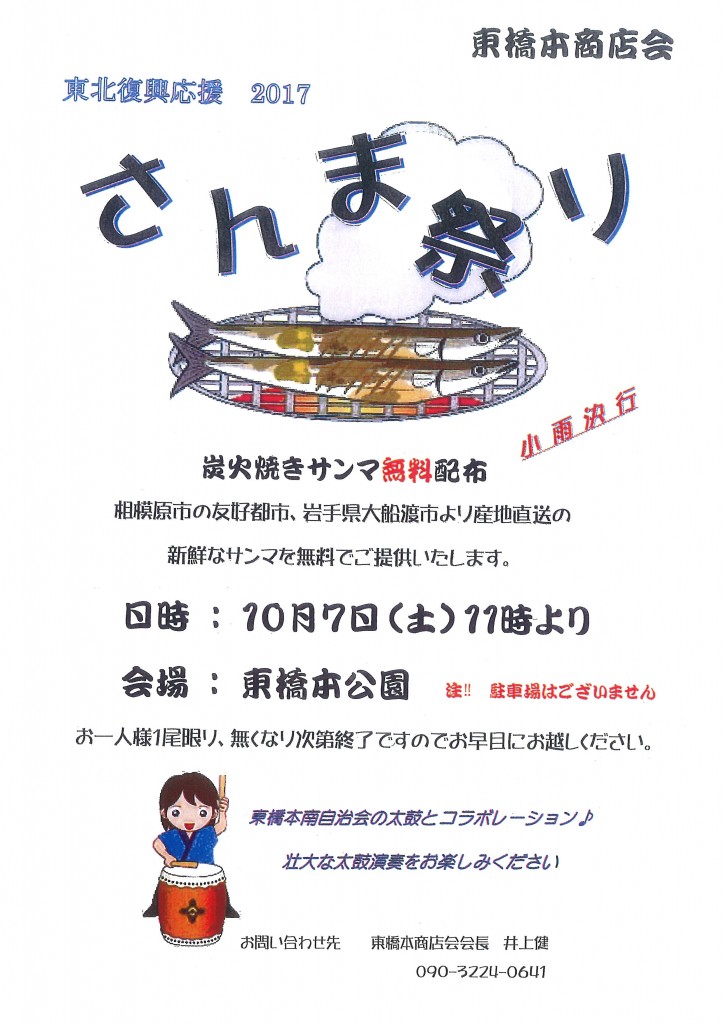 10月7日(土)東橋本公園で炭火で焼いた産地直送の新鮮なさんまを召し上がっていただきます。