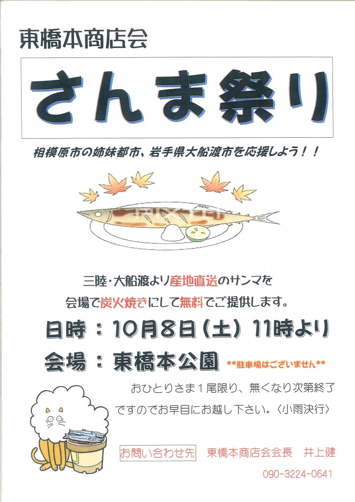 相模原市と姉妹都市である「岩手県大船渡市」から水揚げされたばかりの新鮮なさんまを炭火焼きにして、ご来場のみなさまに召し上がっていただく。というお祭りです。